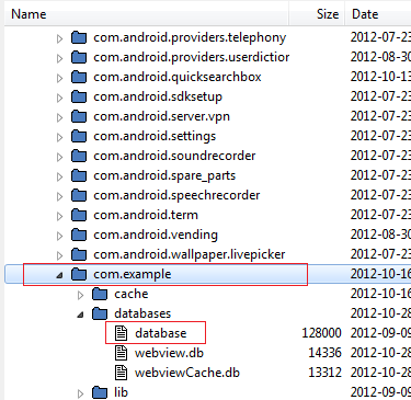 Your database in located in data – data – -databases – . So explore the data folders until you find your database. My package name is com.example and my database is called database (as you will see in the below picture):