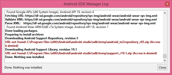 On Android Studio I noticed that if I try to install the android sdk files I get an error like in the image below: (I have Windows 8 on my computer)