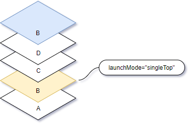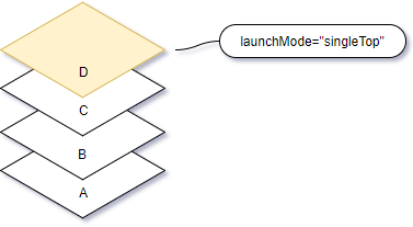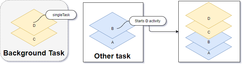As you can see, starting D activity declared as singleTask which already exists in background, from B activity, will move the whole stack of activities from D‘s task in front of B. Thus the back stack of the activities is now A – B- C – D.