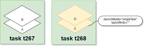 As you can see, A and B activities are in task t267 while C and D are in a new separate task t268. C is the root activity for the new task.