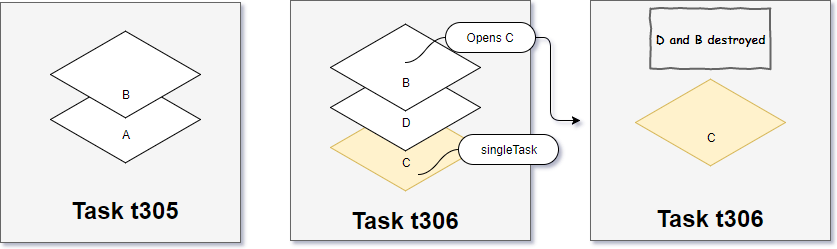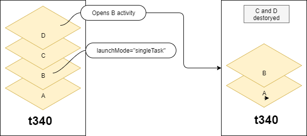 C and D activities have been destroyed even if all activities were in the same task. This happens only if we open again an activity declared as singleTask, in our scenario B. If we had opened A activity, it would have been added on top of D.