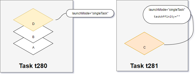 As you can see, C activity is alone in a separate task, while A, B, D are in the same task.