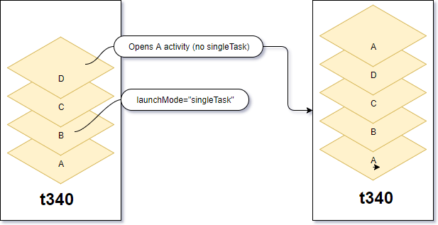 Notice that B activity, even though is declared with launchMode=”singleTask” it seems to be in the same task t340 as the other activities. This means that using singleTask will NOT always put the activity in a new task at the root as the documentation states. BUT declaring singleTask for B is not completely redundant. Look what happens next, when we want to open B again from D activity: